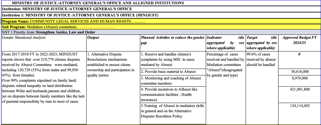 The 2024/25 Gender Budget Statement (GBS) for MINISANTE (Ministry of Health) has several key gender-specific initiatives aimed at addressing disparities in healthcare access. Notably, the budget includes programs targeting maternal health, women’s access to reproductive health services, and efforts to combat gender-based violence. These initiatives are critical for improving gender equity in health, especially for women in rural areas.