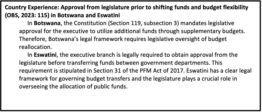 1. Shifts in spending between administrative units: In most countries, the executive branch has some flexibility to shift spending between ministries and departments; however, to promote accountability, the executive should seek legislative approval before making major changes to the budget (e.g., shifting funds between administrative units) (OBS 2024b:130-131). Failing to do so can weaken the budget process and undermine legislative oversight provided during the approval process.