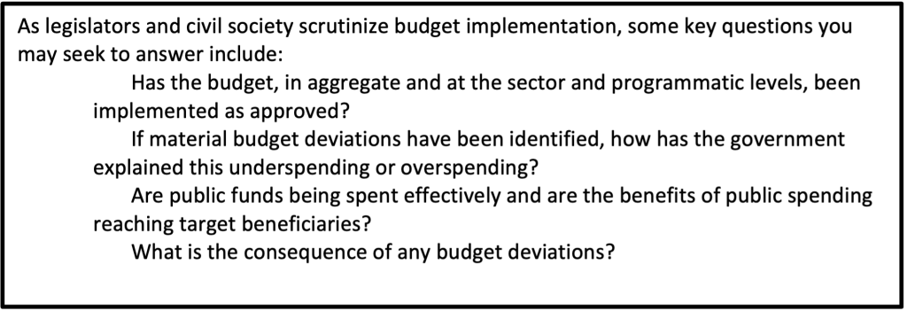 First, parliaments should monitor implementation of the budget, including reviewing In-Year Reports (IYR), produced by the Ministry of Finance (MoF) to compare actual expenditures with approved budget allocations. This enables legislatures to assess whether funds are being spent effectively and for their intended purpose. This oversight function ensures accountability, transparency, and effective use of public funds. Legislative oversight of budget execution typically takes place within parliamentary committees, such as a specialized budget or finance committee. The committee may invite finance ministry officials to respond to questions regarding budget implementation. Good practice indicates that legislatures, in committee, should examine in-year implementation of the budget at least three times during the budget year and publish a report with findings and recommendations (OBS 2024b:128).