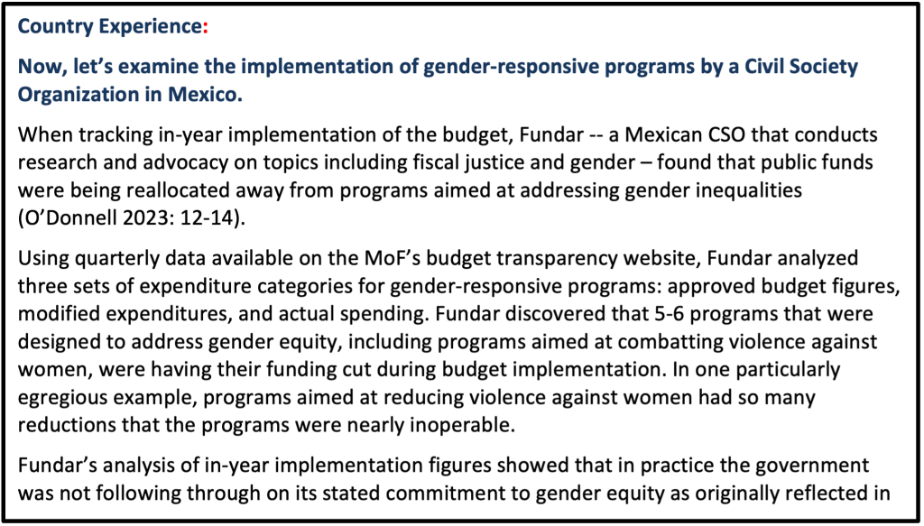 These types of gaps in budget execution information, including the lack of justifications for budget deviations, are a key challenge impeding parliamentary oversight of budget implementation and can prevent parliament and other stakeholders from understanding budget credibility challenges. Research by the International Budget Partnership has shown that higher budget transparency is associated with better budget credibility (IBP 2022:44)