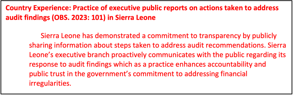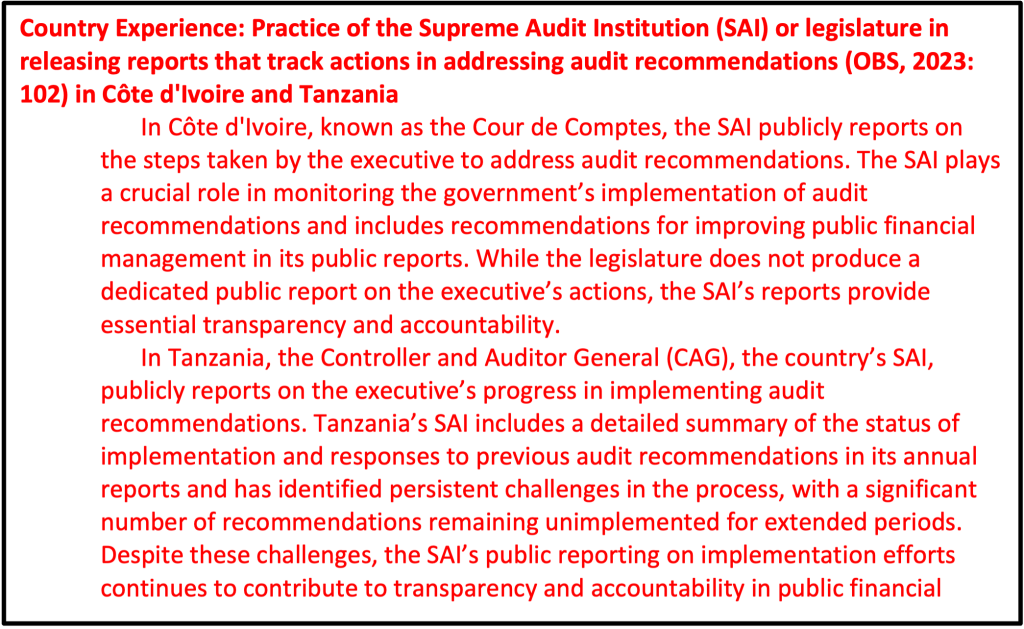 ‘Dynamic interaction’ between legislatures and SAIs is critical to pressuring executives to implement audit recommendations and report on their progress (ibid). After the SAI submits the financial audit report to the legislature, a legislative committee should examine the Audit Report on the annual budget (IBP 2024b:132).