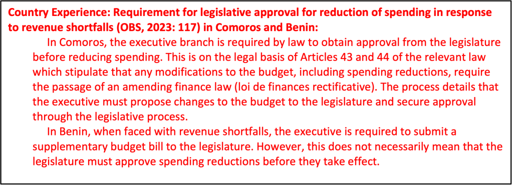 3. Authorize reductions in spending below levels in the Enacted Budget: Similarly, the executive branch should seek legislative approval before reducing spending in response to lower than anticipated revenues. Such a requirement may be set out in the relevant laws or regulations, such as a public finance act. Without it, the executive branch has the discretion to substantially change the composition of the budget with no legislative control (IBP 2024b:131). Reductions in spending are often approved as part of supplementary budget, which is typically presented by the MoF, scrutinized in budget or finance committee, and approved in plenary. While examining the supplementary budget, committee members may request finance ministry officials attend hearings to respond to questions.