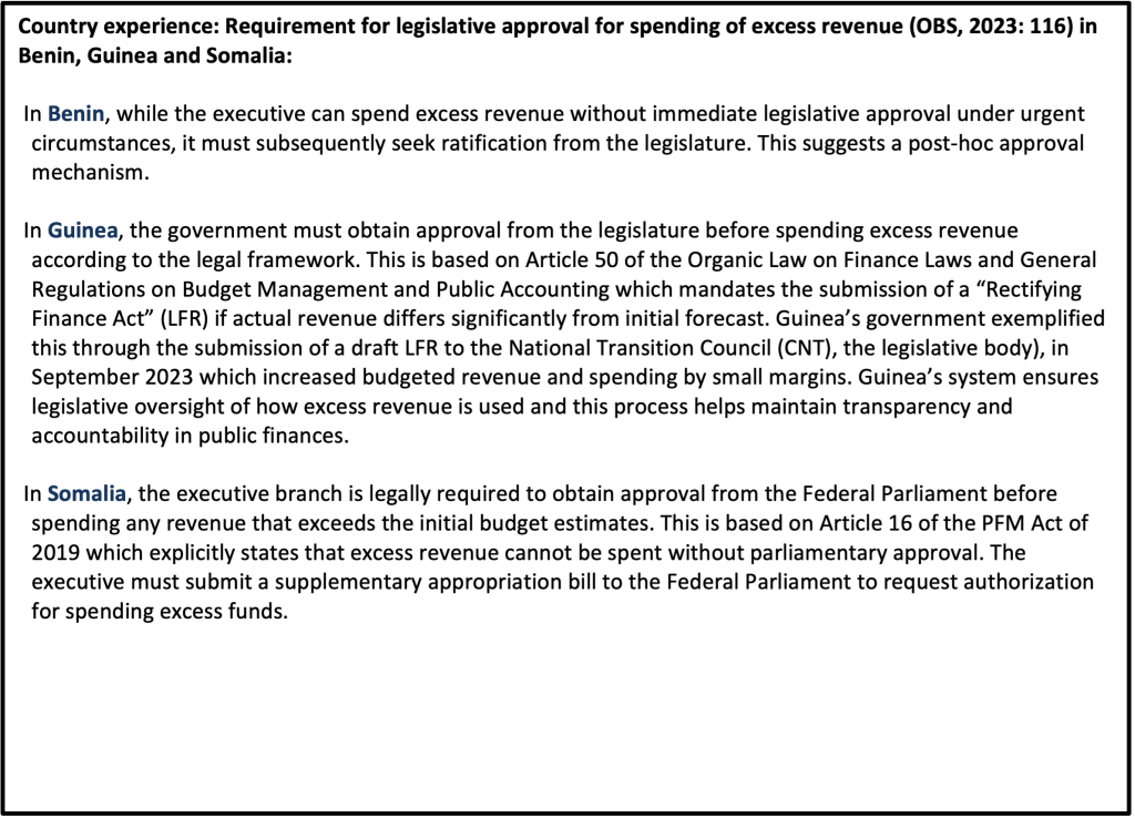 2. Authorize spending excess revenue: The executive branch should seek legislative approval before spending excess revenue. If such a requirement is not in place, the executive branch may have an incentive to underestimate revenue in the budget proposal to have the discretion to spend additional resources without legislative oversight (IBP 2024b:130).