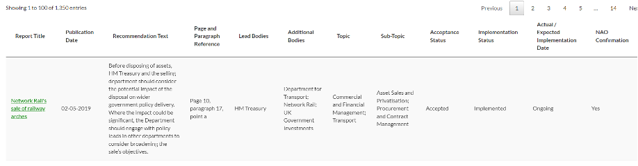 - Exceptions, however, do exist. For example, the National Audit Office in the United Kingdom has an online tool to track the Executive’s progress on implementing audit recommendations (IBP 2022: 37). The Tracker is updated every six months and includes information on whether the government has accepted recommendations, the current state of implementation progress, and the departments responsible for implementation. The tracker is designed to be an interactive tool that allows users to explore the dataset in different ways.
