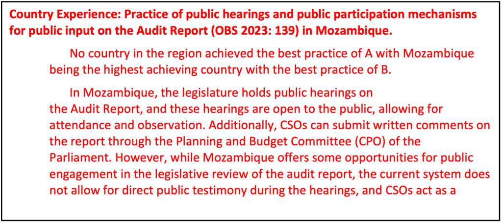 - In addition, to promote transparency and accountability, legislatures may establish opportunities for members of the public to testify during these hearings or put in place other mechanisms to collect public views on the audit report (for example, soliciting written submissions). Opening hearings on the Audit Report to the public creates opportunities for the public to learn about how the government has managed public funds during the budget year and demands accountability in instances of mismanagement (OBS 2024b:153).